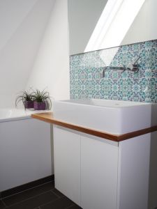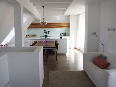 Die Obergeschosswohnung eines Vierfamilienhauses aus dem Jahr 1934 erhielt eine zweite Etage, indem sie mit dem vorher ungenutzten Spitzboden verbunden wurde. Über den Dächern von Münster entstand so ein Küchen- und Wohnbereich, dessen 30-m²-Dachterrasse das Wohnen im Sommer nach draußen verlagert. Ein kleines Bad mit rundem Duschbereich und separatem Gäste-WC integriert sich durch Licht und Transparenz in das lichtdurchflutete Dachgeschoss.