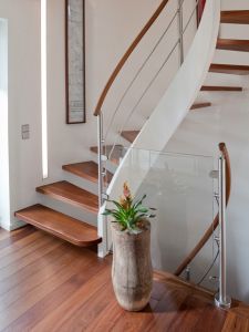 Der neue, offene Grundriss verbindet die Küche mit dem Esszimmer. Eine Treppe, deren Stufen ohne Seitenwange direkt aus der Wand kommen, rundet den offenen Raumeindruck ab.